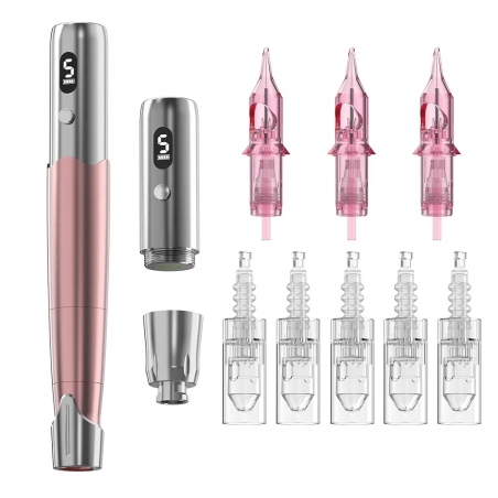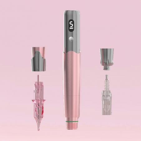 Notre stylo sans fil possède un double embouts qui permet de travailler aussi bien les prestations médico-esthétiques comme le Microneedling et la Microdermabrasion ainsi que le Maquillage Semi-Permanent.
